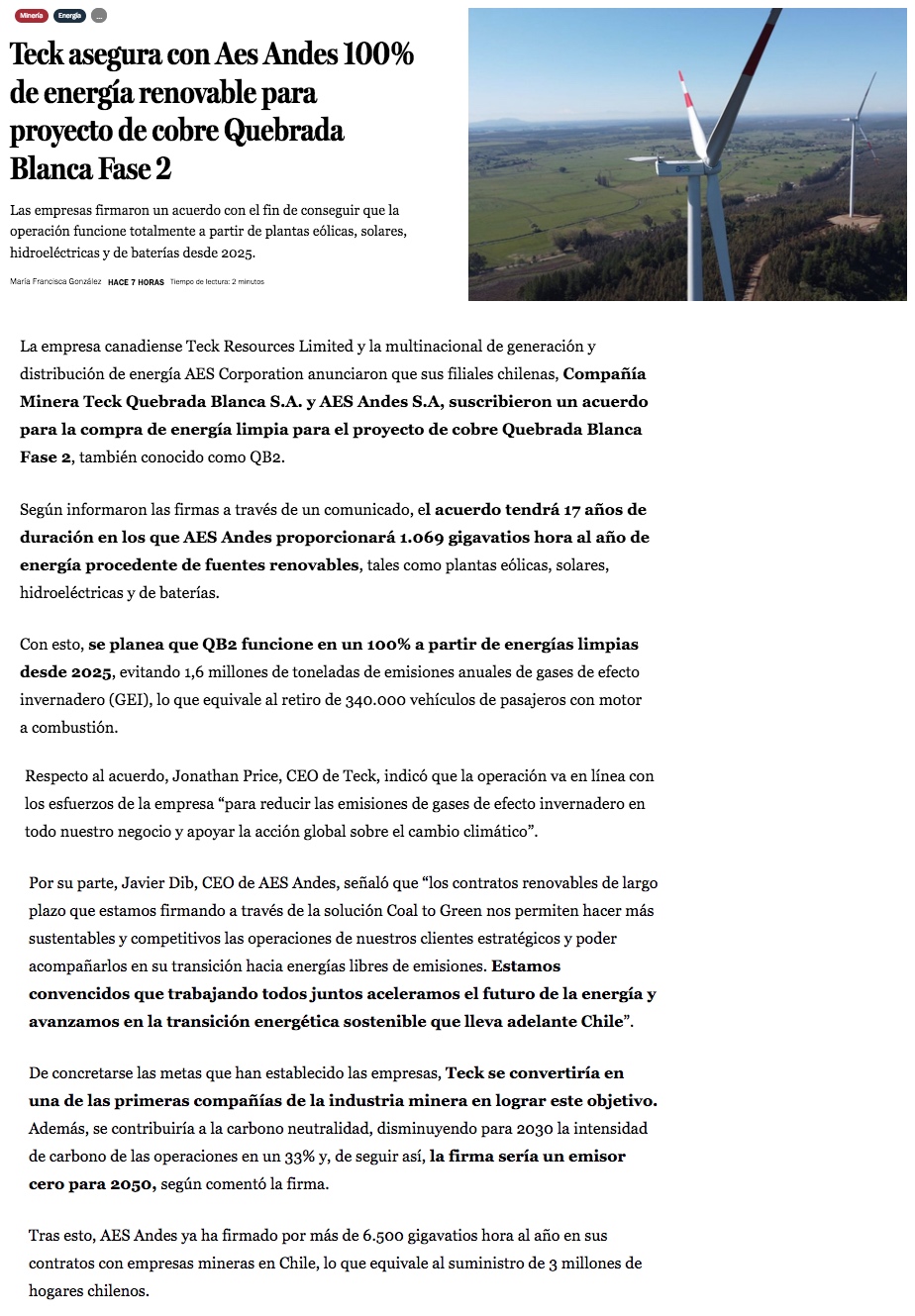 Quebrada Blanca Fase 2 operará su faena con un 100% de energía limpia - (Estrella de Iquique)