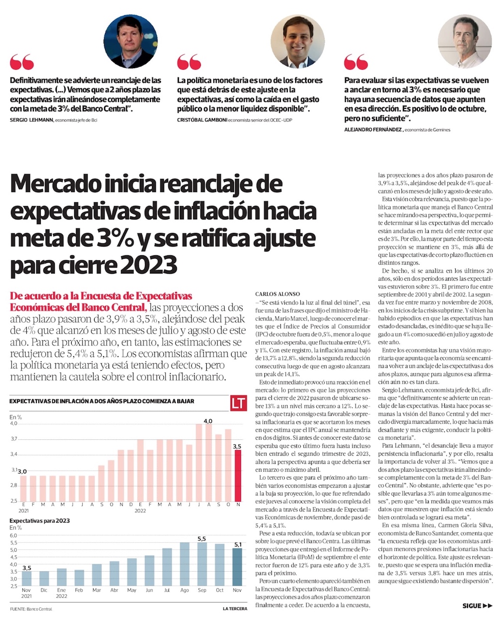 Expectativas de inflación a dos años plazo se moderan desde 3,9% a 3,5% y se acerca a meta del Banco Central - (El Mercurio de Santiago)