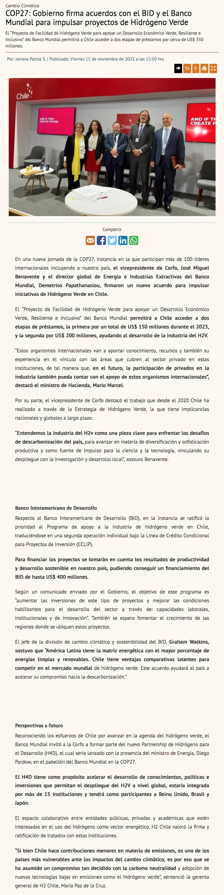 Gobierno firma acuerdos con el BID y el Banco Mundial para impulsar proyectos de hidrógeno verde - (emol)