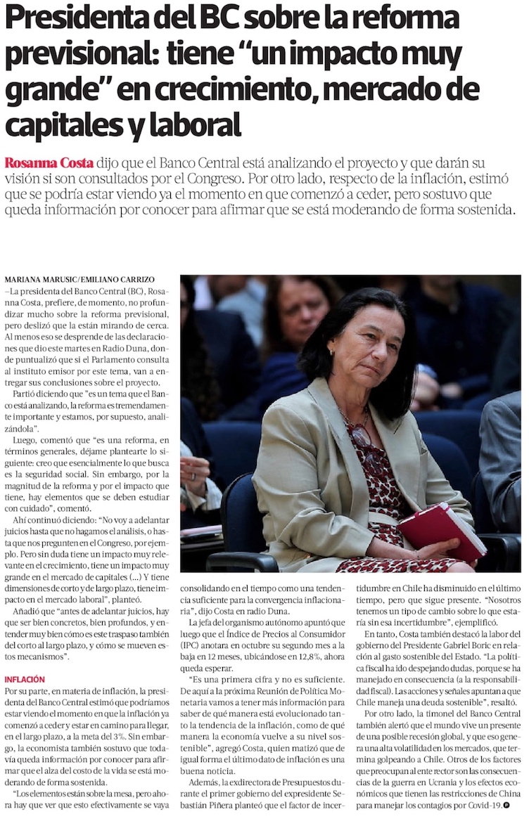 Costa ve “impacto muy grande” de reforma de pensiones en crecimiento y mercado de capitales - (Diario Financiero)