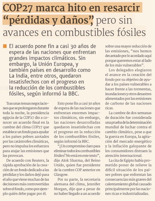 La COP27 termina con un acuerdo “histórico” sobre un nuevo fondo de pérdidas y daños - (El Mercurio de Santiago)