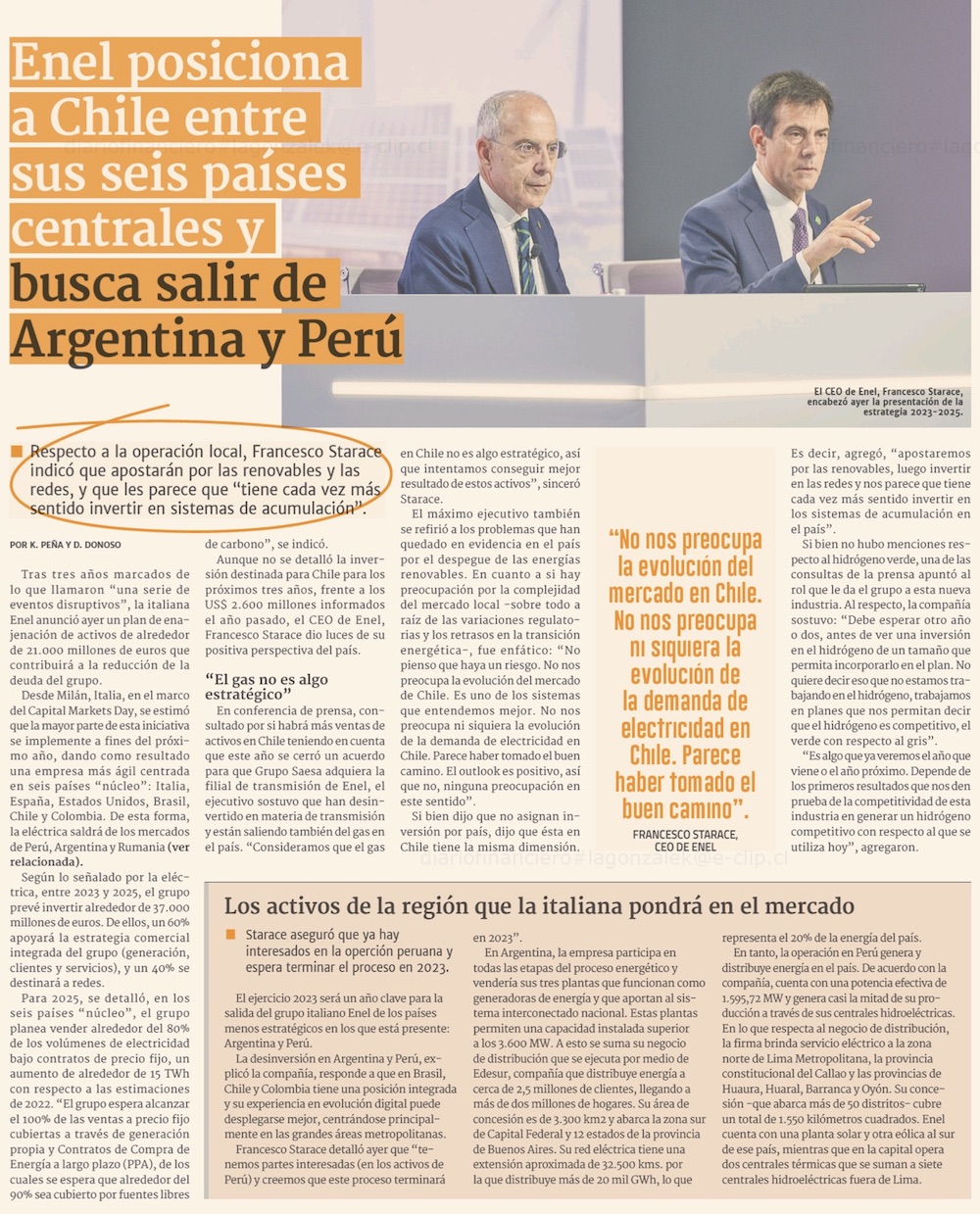 Enel saldrá de Argentina y Perú, en medio de reorganización de sus activos a nivel global - (El Mercurio de Santiago)