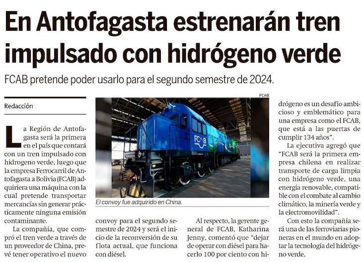 FCAB convertirá a hidrógeno verde sus flotas de locomotoras y camiones - (El Mercurio de Antofagasta)