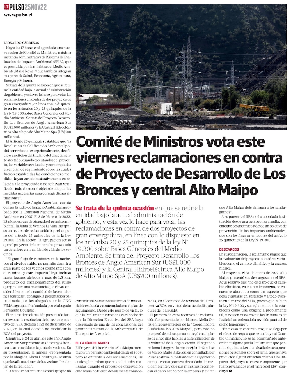 Comité de Ministros se reúne hoy para revisar recursos ciudadanos por Los Bronces y Alto Maipo - (Diario Financiero)