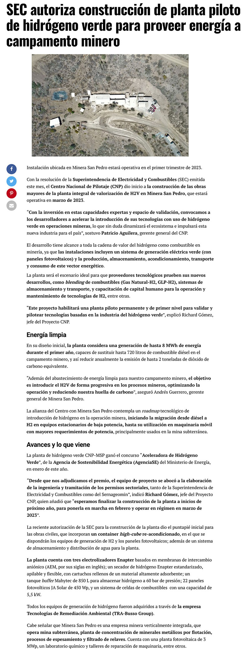 SEC autoriza construcción de planta piloto de hidrógeno verde para proveer energía a campamento minero - (mch.cl)