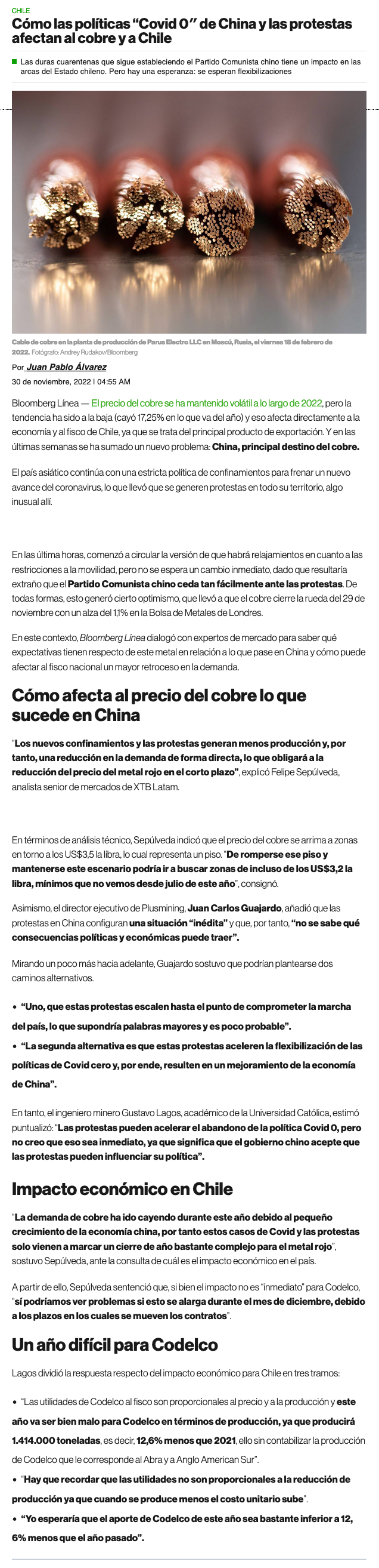 Cotización del cobre acumula en noviembre su mayor alza mensual en más de un año - (El Mercurio de Santiago)