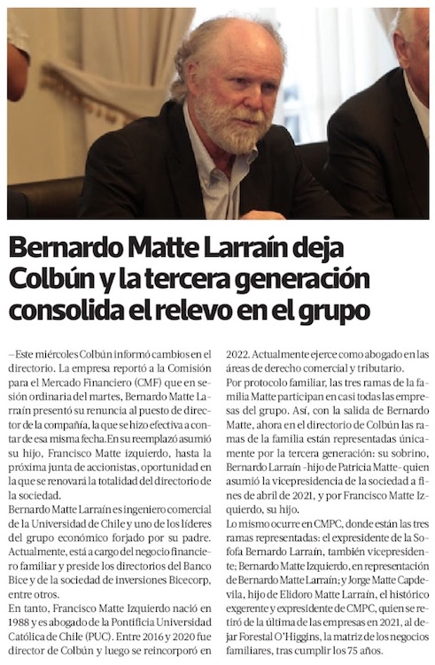 Bernardo Matte renuncia al directorio de Colbún - (El Mercurio de Santiago)