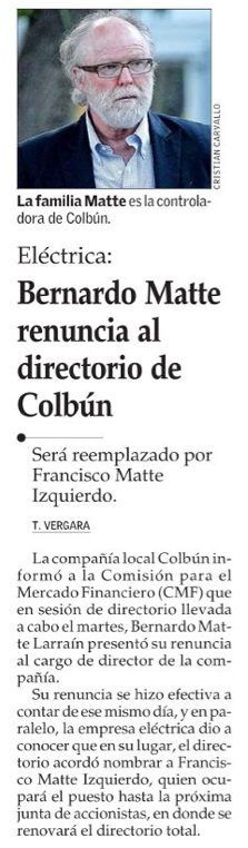 Bernardo Matte Larraín deja Colbún y la tercera generación consolida el revelo en el grupo - (Pulso)