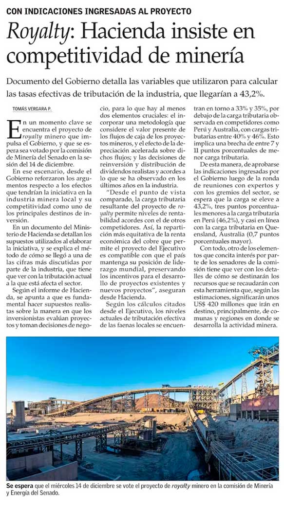 Hacienda calcula que grandes mineras tendrían carga tributaria de 43,2% con un nuevo royalty - (Diario Financiero)