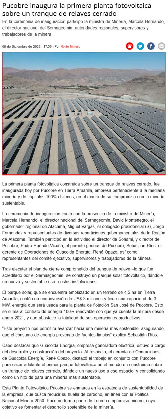 Pucobre invierte US$ 3 mills. en planta solar sobre un relave - (El Mercurio de Santiago)