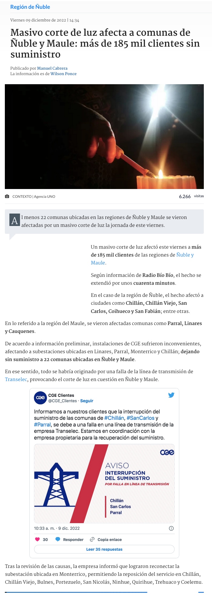 CGE informó que corte de luz afectó a 105 mil usuarios de Ñuble y Maule - (La Discusión)