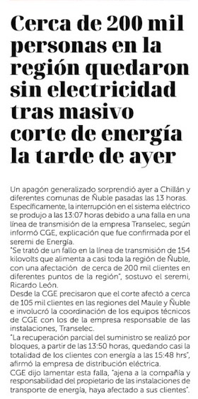 CGE informó que corte de luz afectó a 105 mil usuarios de Ñuble y Maule - (La Discusión)