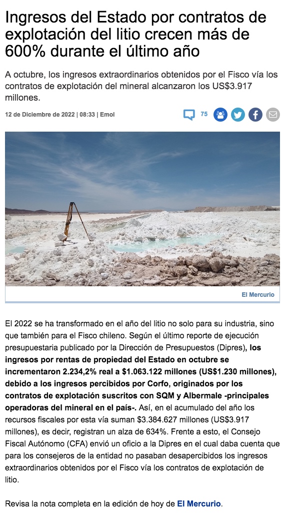 Explotación del litio: informes revelan que ingresos del Fisco logran alza de un 634% este 2022 - (biobiochile online)