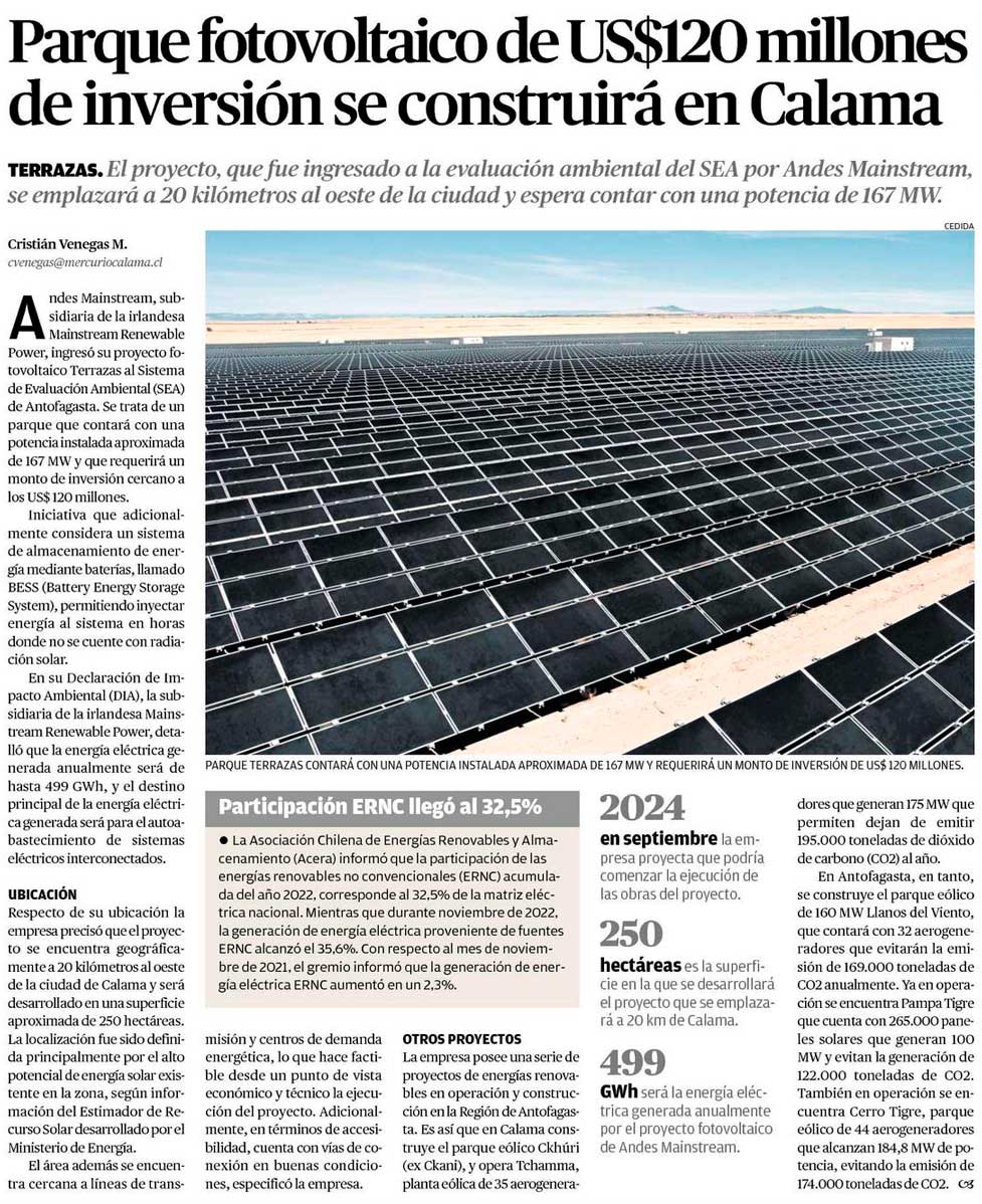 Parque fotovoltaico de US$120 millones de inversión se construirá en Calama - (El Mercurio de Calama)