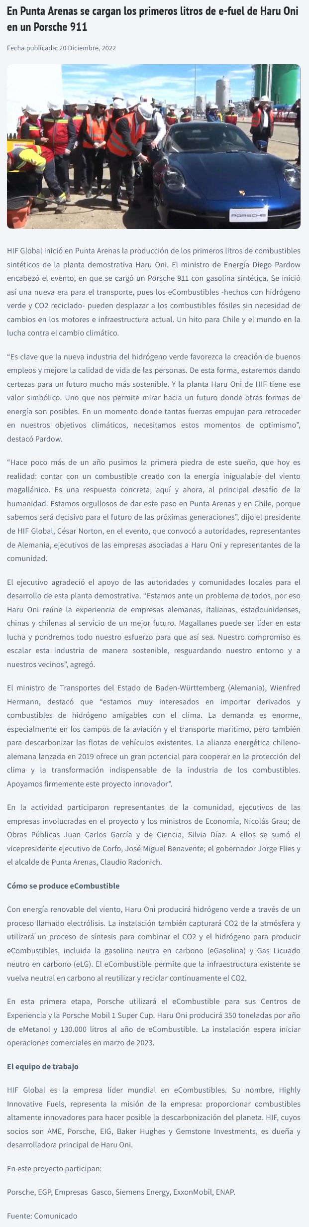 Empresa chilena inicia producción de hidrógeno verde: un Porsche es el primero en llenar el estanque - (biobiochile online)
