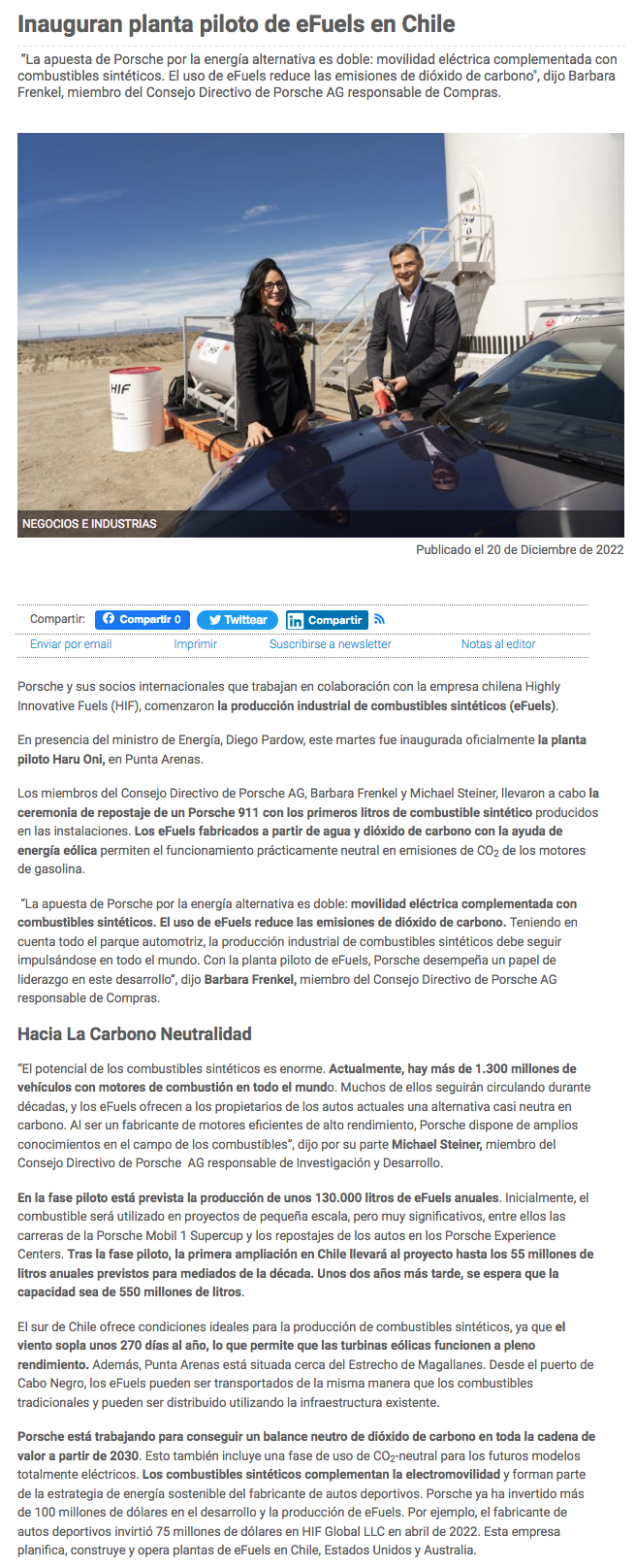 Empresa chilena inicia producción de hidrógeno verde: un Porsche es el primero en llenar el estanque - (biobiochile online)