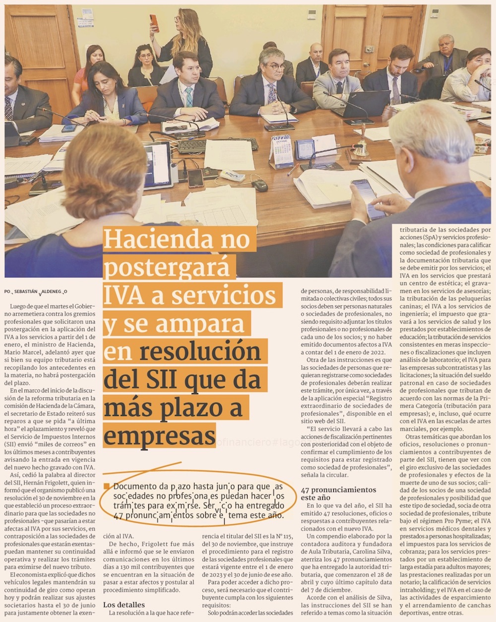 Hacienda desestima postergación de IVA a servicios, pero apunta a oficio del SII que da plazo para ajustarse - (El Mercurio de Santiago)