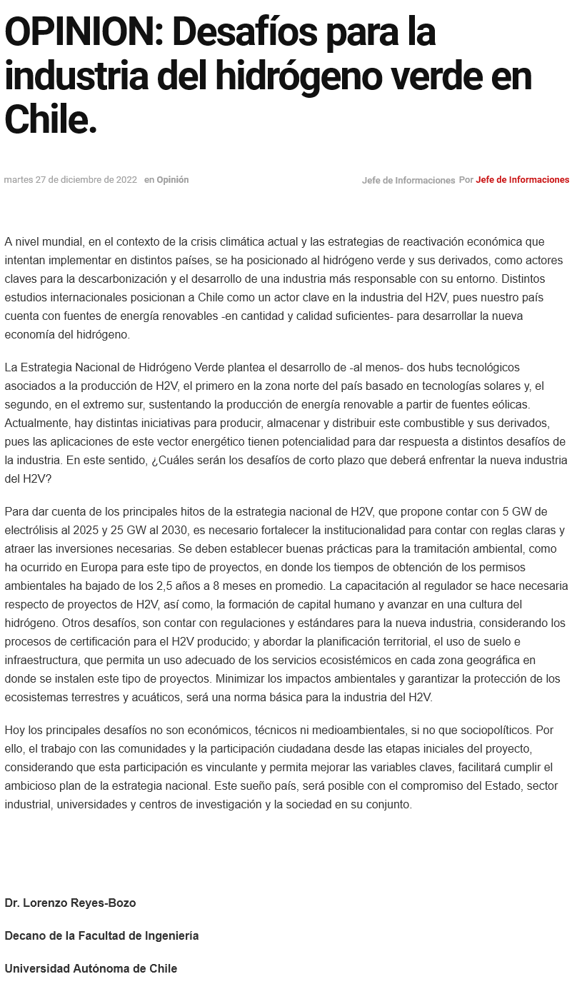 Desafíos para la industria del hidrógeno verde en Chile - (El Día)