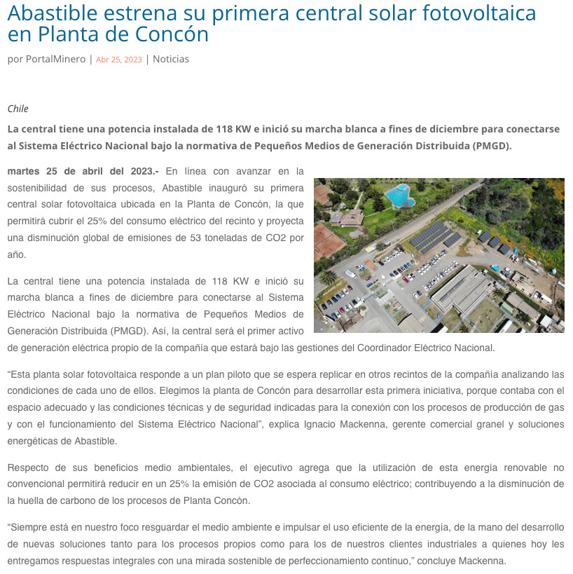 Abastible estrena su primera central solar fotovoltaica en Planta de Concón - (g5noticias.cl)