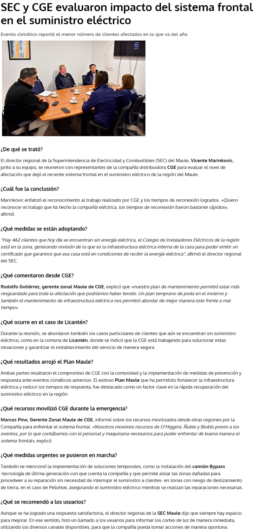 SEC y CGE evalúan impacto del sistema frontal en el suministro eléctrico de la región del Maule - (El Heraldo (Linares))