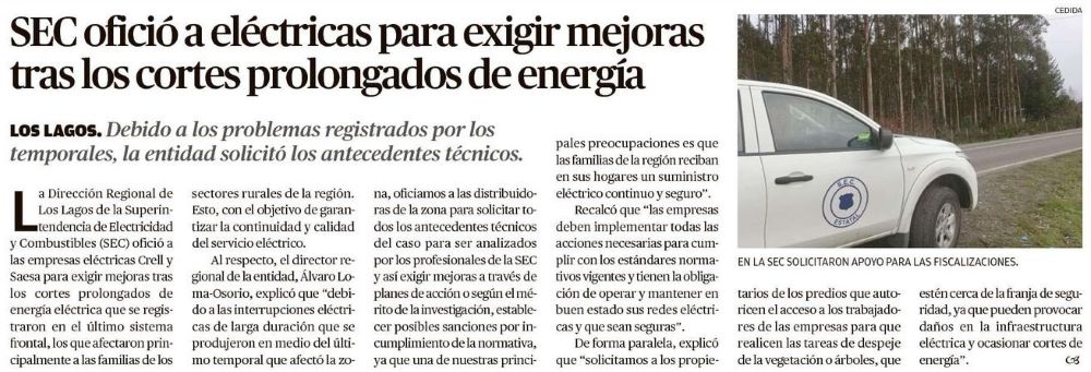 SEC ofició a eléctricas para exigir mejoras tras los cortes prolongados de energía - (El Austral de Osorno)