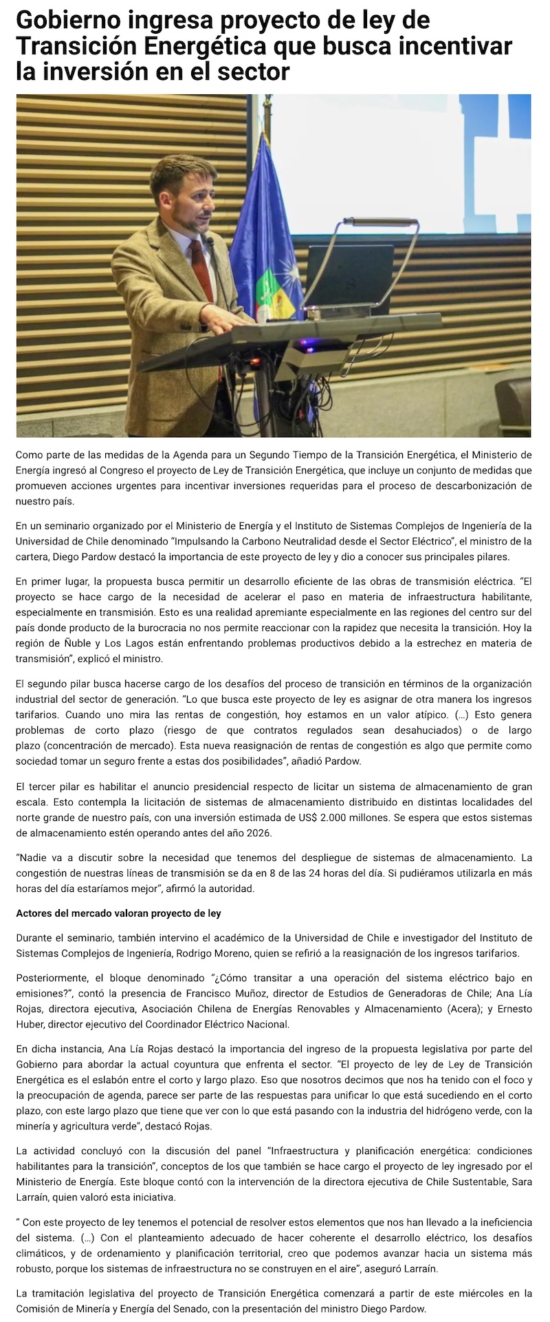 Gobierno ingresa proyecto de ley de Transición Energética que busca incentivar la inversión en el sector - (electromineria.cl)