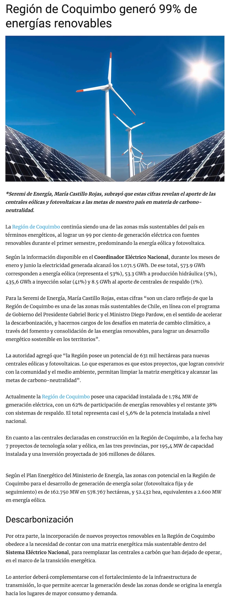 Generación con energías renovables logró el 99% en la Región de Coquimbo - (norteyenegia.cl)
