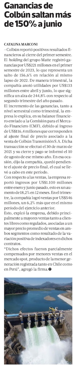 Colbún eleva sus utilidades en 156% - (El Mercurio de Santiago)
