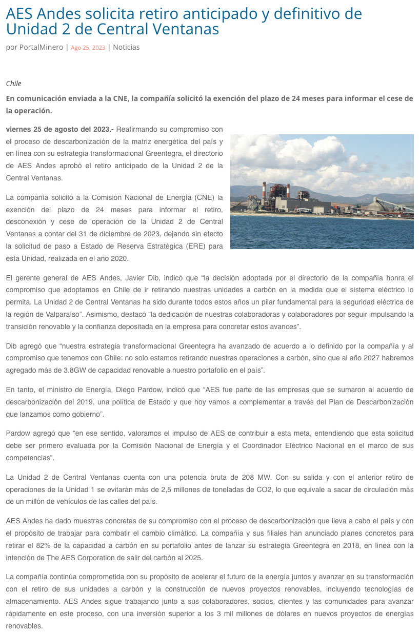 AES Andes solicita retiro anticipado de termoeléctrica Ventanas II: unidad saldría de operación a fines de 2023 - (terram.cl)