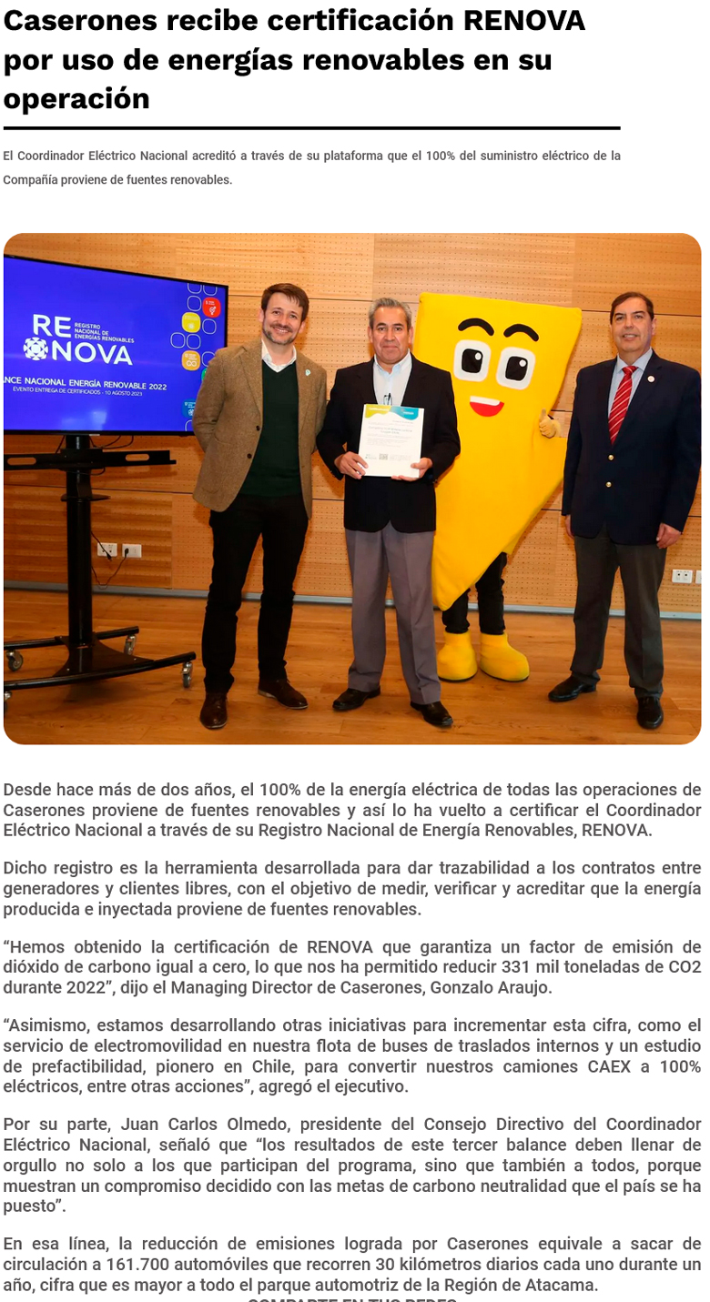 Caserones recibe certificación RENOVA por uso de energías renovables en su operación - (elzorronortino.cl)