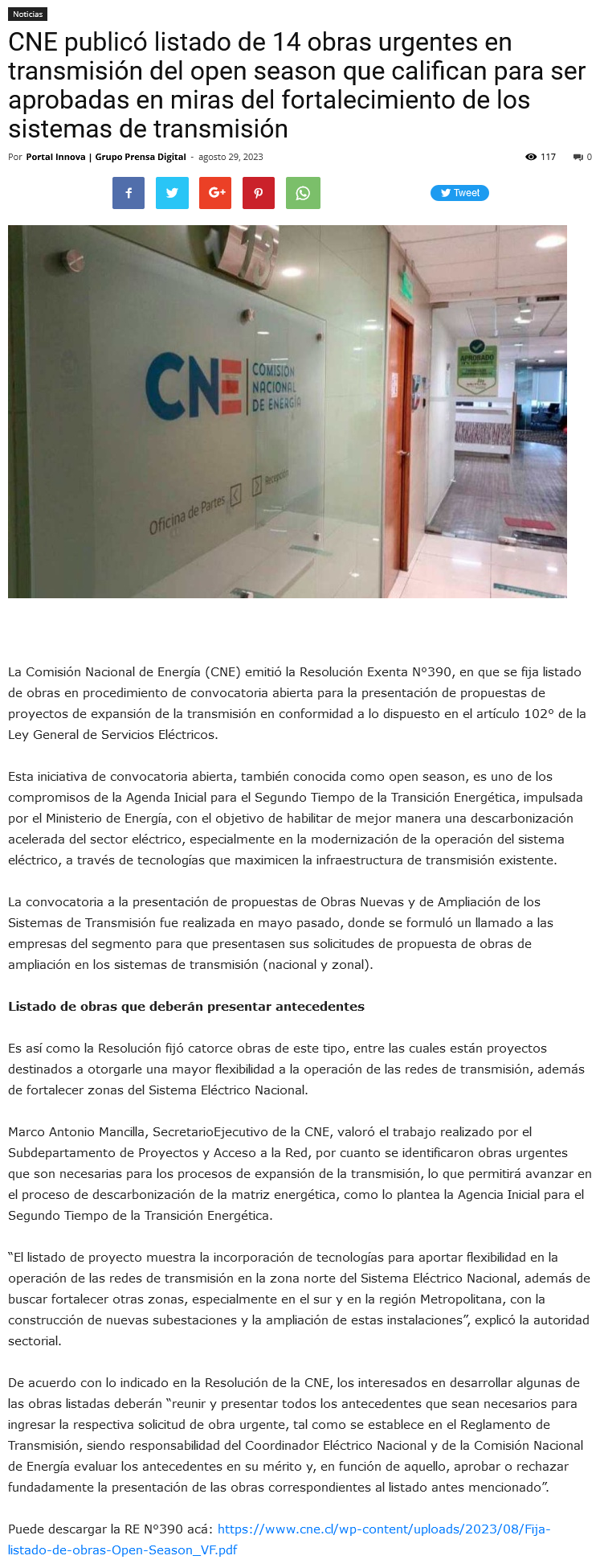 CNE publica listado de 14 obras urgentes en transmisión del open season que califican para ser aprobadas - (revistaei.cl)