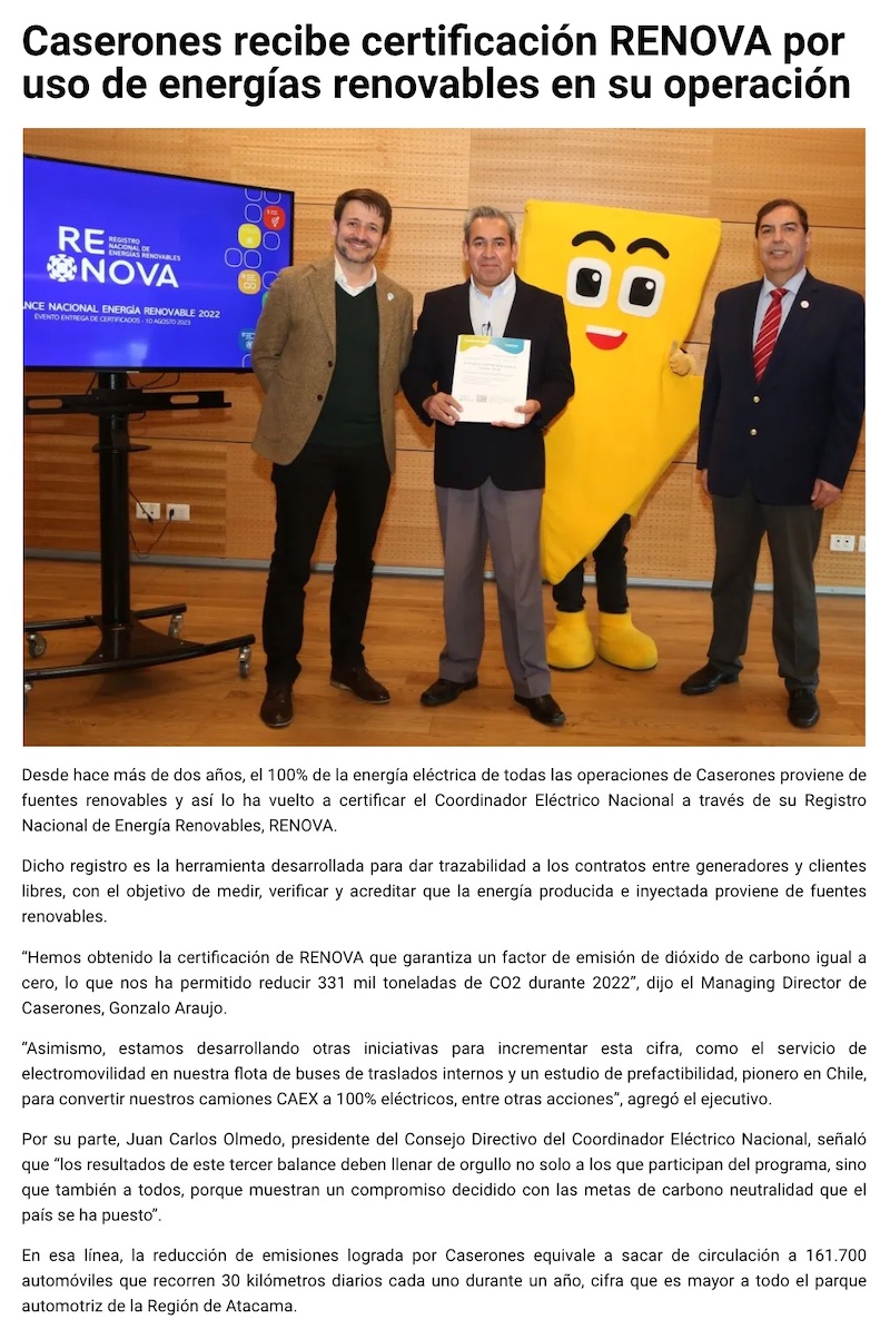 Caserones recibe certificación RENOVA por uso de energías renovables en su operación - (madero.cl)
