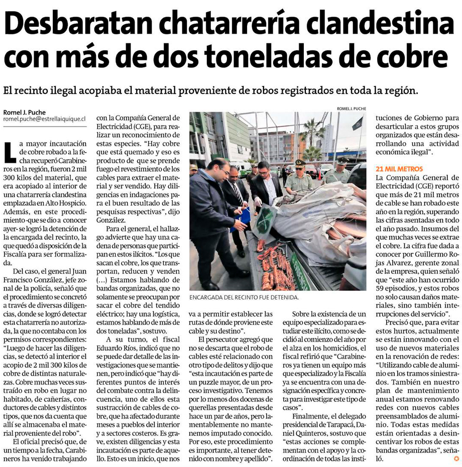 Carabineros incautó más de dos toneladas de cobre en la comuna de Alto Hospicio - (laNacion)