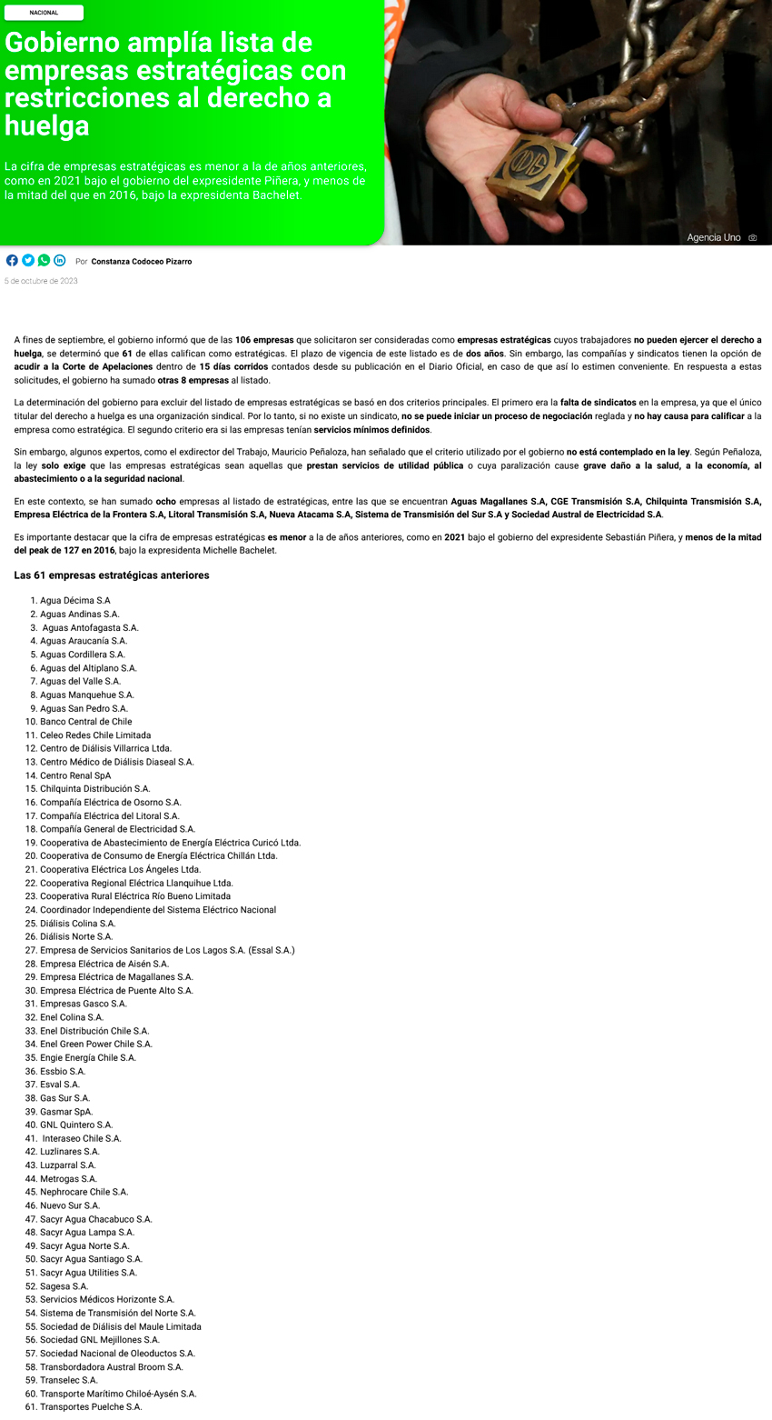 Gobierno suma ocho nuevas empresas a listado de firmas sin derecho a huelga - (Diario Financiero)