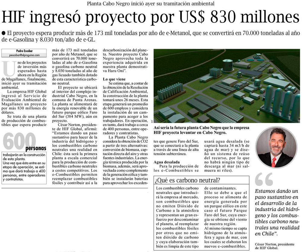 Hif Global ingresó proyecto para planta en Cabo Negro - (La Prensa Austral)