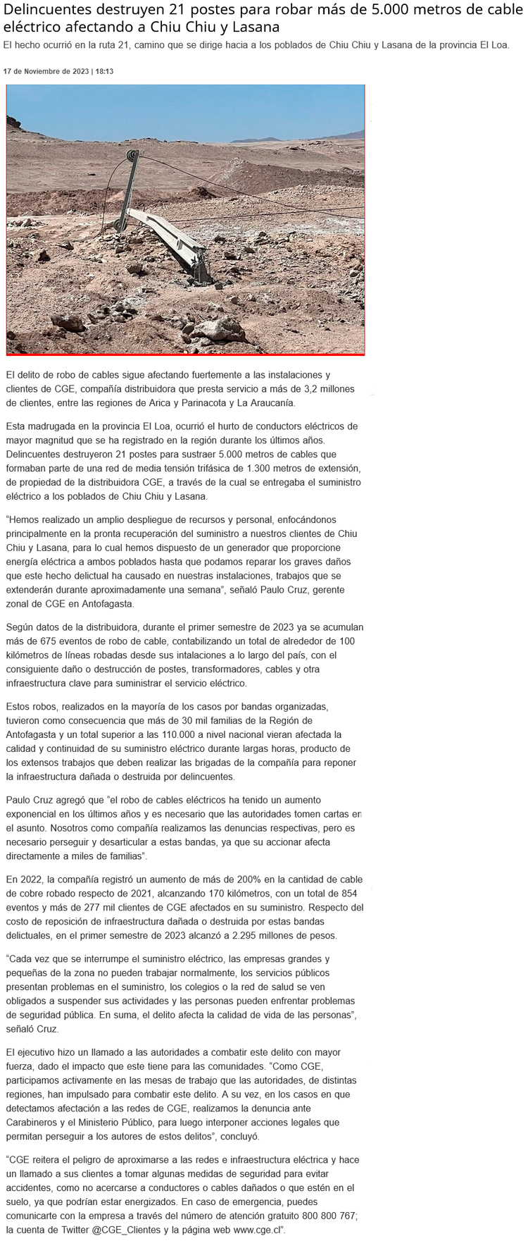 Destruyen 21 postes para robar más de cinco kilómetros de cable eléctrico: poblados de Chiu Chiu y Lasana los más afectados - (El Mercurio de Calama)