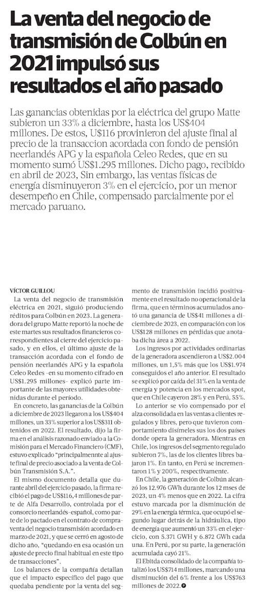 Ganancias de Colbún subieron 33% en 2023 a US$ 403,8 millones - (Diario Financiero)