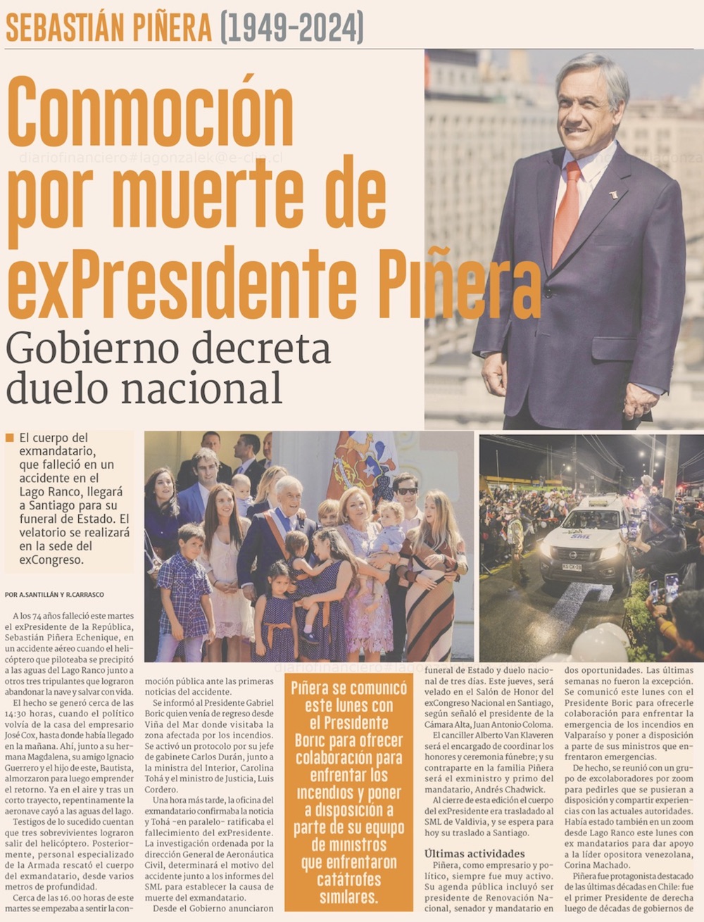 El expresidente Sebastián Piñera muere al capotar su helicóptero en el lago Ranco: no pudo abrir su cinturón de seguridad - (El Mercurio de Santiago)