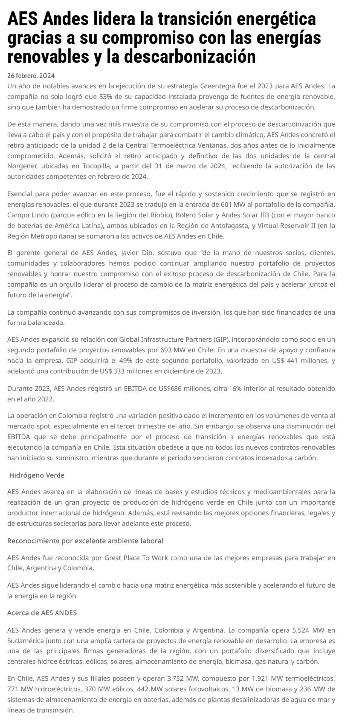 AES Andes lidera la transición energética gracias a su compromiso con las energías renovables y la descarbonización - (g5noticias.cl)