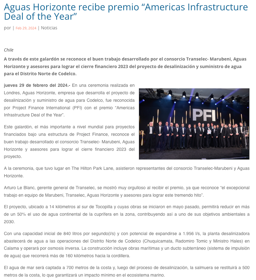 Aguas Horizonte recibe prestigioso premio por proyecto de desalinización para Codelco - (mch.cl)