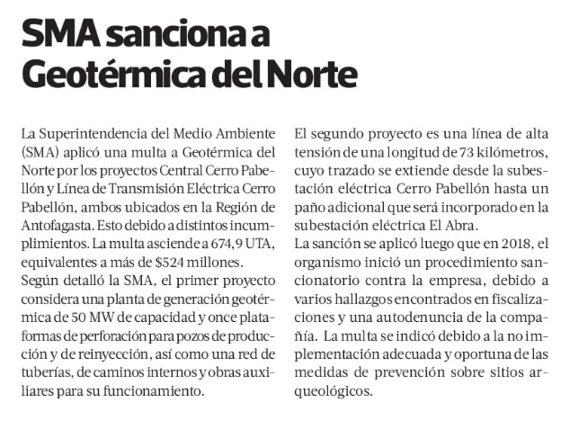 SMA aplica multa a Geotérmica del Norte - (El Mercurio de Santiago)