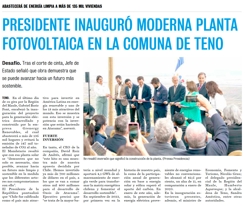 Presidente inauguró moderna planta fotovoltaica en la comuna de Teno - (La Prensa Curicó)
