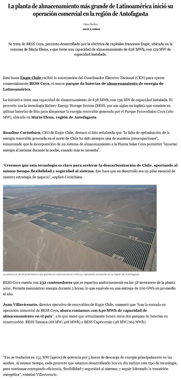 Engie inicia operación comercial de BESS Coya, el mayor parque de baterías de almacenaminto de energía en América Latina - (DF Online)