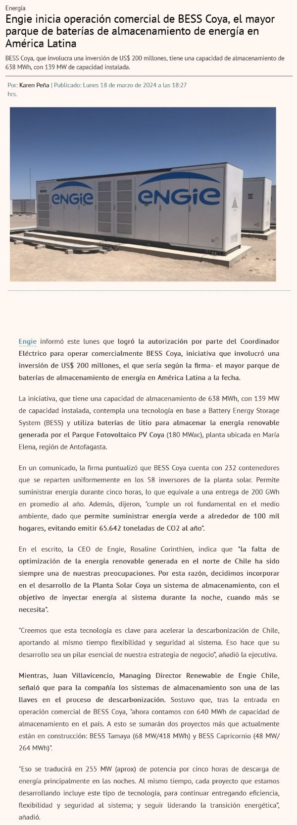 La planta de almacenamiento más grande de Latinoamérica inició su operación comercial en la región de Antofagasta - (La Tercera Online)
