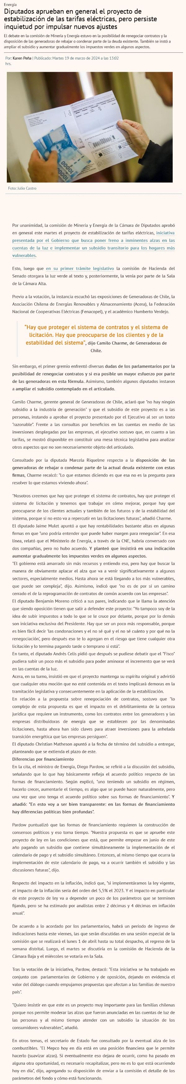 Cuentas de la luz: Diputados aprueban en general proyecto de estabilización del Gobierno - (El Mercurio de Santiago)