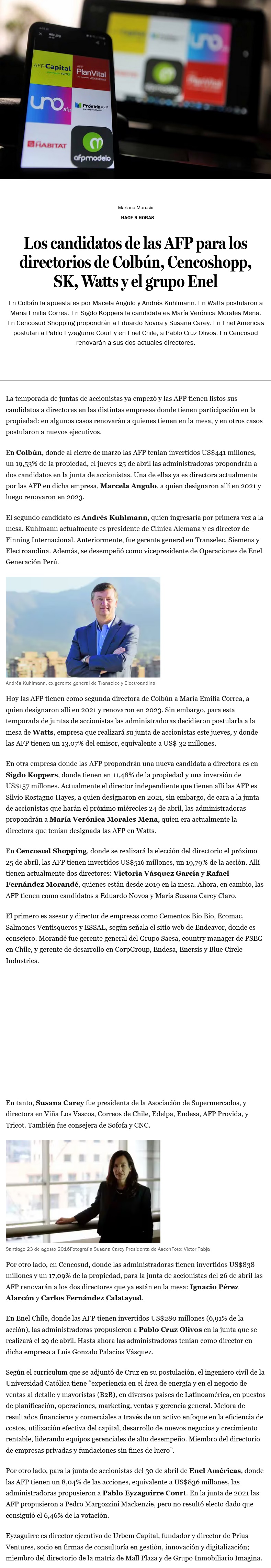 Los candidatos de las AFP para los directorios de Colbún, Cencoshopp, SK, Watts y el grupo Enel - (Pulso)