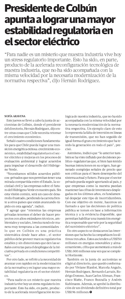 Presidente de Colbún apunta a lograr una mayor estabilidad regulatoria en el sector eléctrico - (La Tercera Online)