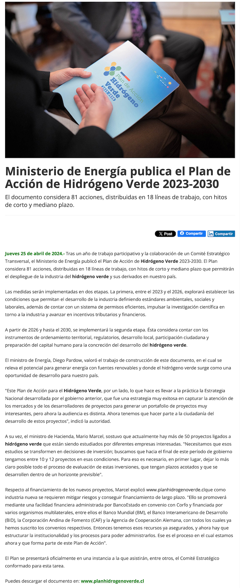 El Ministro de Energía de Chile, Diego Pardow, detalló el Plan de Acción de Hidrógeno Verde 2023-2030 - (h2news.cl)
