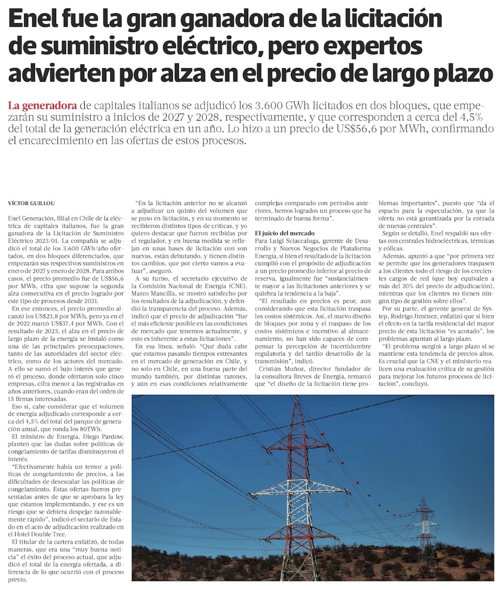 Enel se adjudica totalidad de la energía en licitación - (El Mercurio de Santiago)