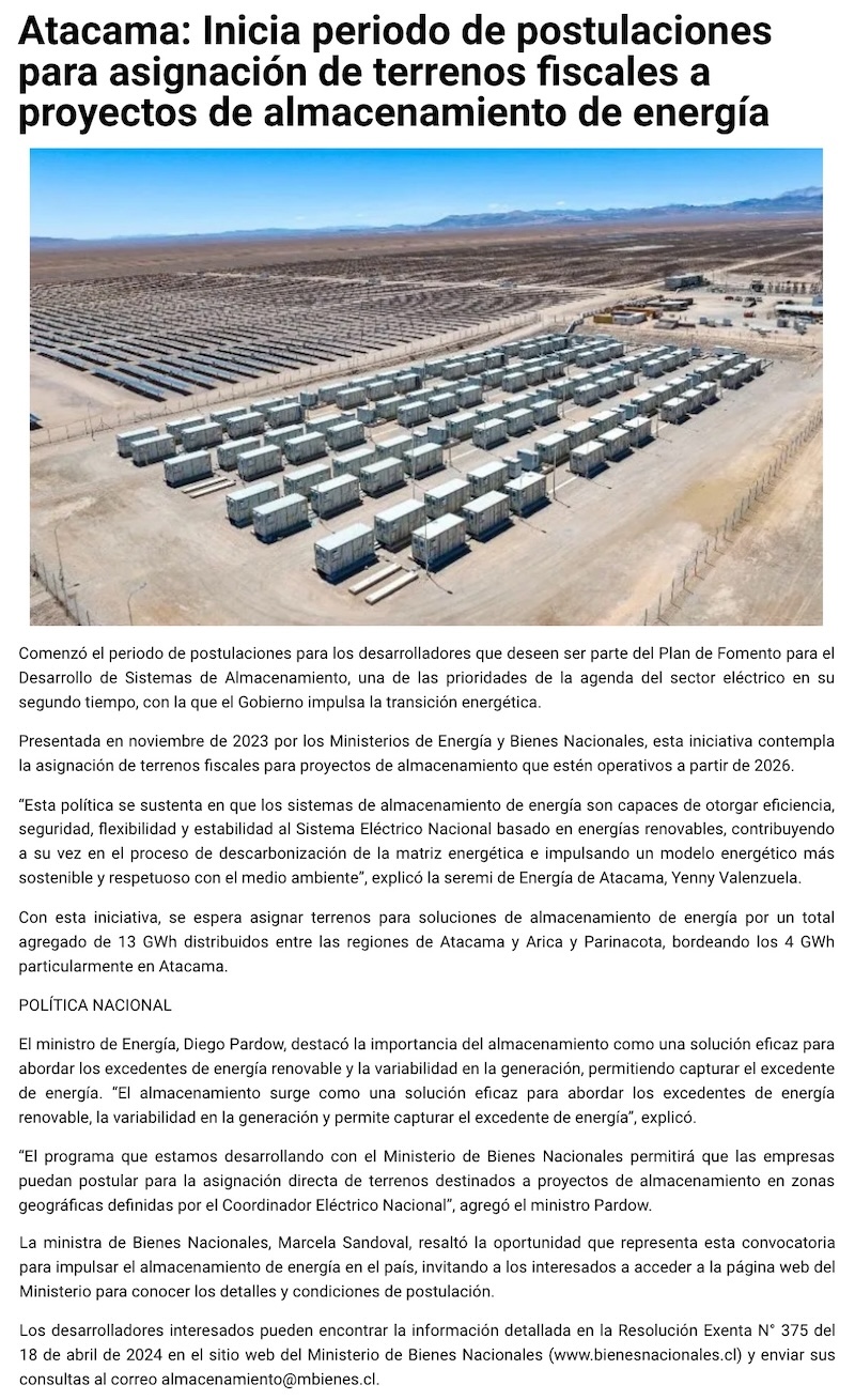 Atacama: Inicia periodo de postulaciones de terrenos fiscales a proyectos de almacenamiento de energía - (atacamanoticias)